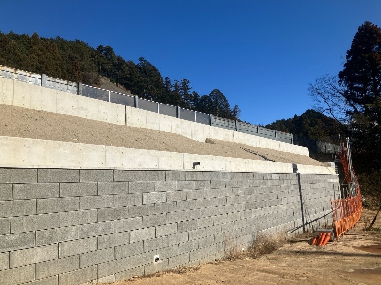 軽量盛土の正面には壁面パネルを取付けます。こちらも機械を必要とせずに人力で設置する事が出来ます。パネル部材の種類が多く間違えない様に図面と見比べながら施工しています。軽量盛土が出来上がって来ると道路のイメージがわかりやすくなると思いました。