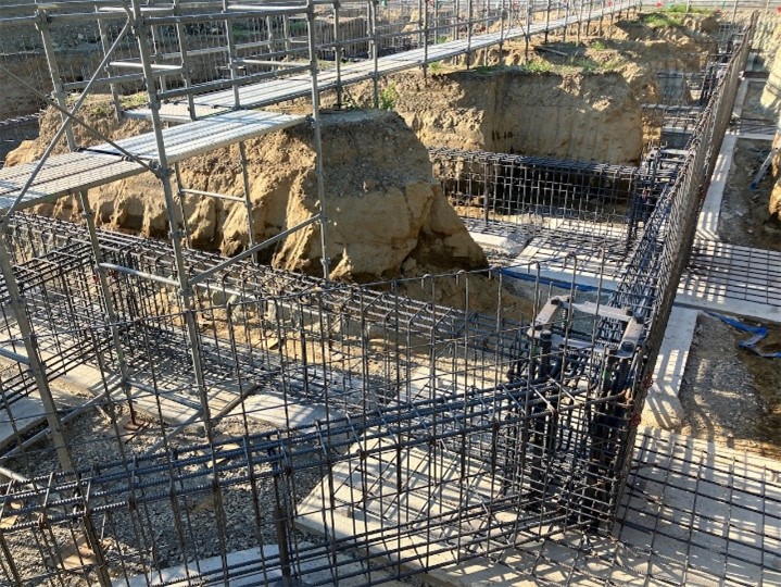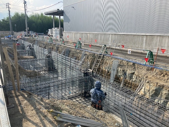 土工事ではバックホウを使い掘削作業を進めていきました。掘削深さも深くなっているので、足元注意で作業を行いました。次に均しコンクリートの打設です。この現場では2工区に分けて行いました。現在は土工事が終わり、鉄筋工事の基礎配筋を進めております。基礎配筋では、鉄筋の太さ、本数、位置に間違いがないか1つ1つ漏れのないように確認を行っております。