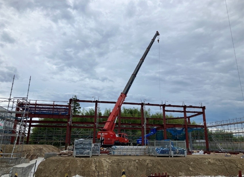 工事の方は、9月から始めた鉄骨建て方が完了いたしました。鉄骨は一番高いところで約11.5mあります。鉄骨建て方はレッカーを使用し、一つ一つの部材を順番に組み立てていきます。鉄骨が建つと建物の形が分かるようになり、現場の景色がガラッと変わります。