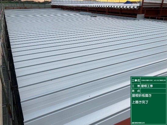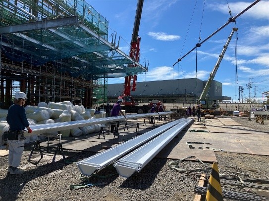 今回の屋根は、現場成型で行いました。現場成型とは、運搬が難しい長い屋根材を現場で成型機を使い加工し、加工した屋根材をクレーンでつり上げ、屋根上まで運ぶ作業になります。屋根上まで運ばれた材料を職人さんが息を合わせて一枚づつ敷き並べて屋根葺きをします。