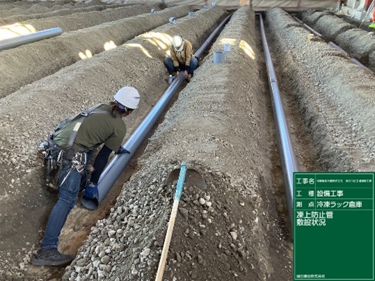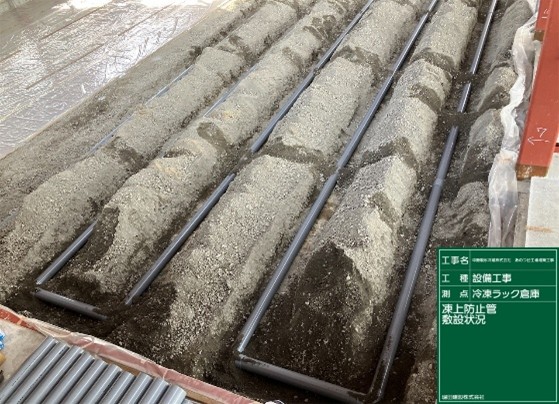 凍上防止管とは何かについて触れていきたいと思います。凍上防止管とは、室内の温度が氷点下になる部屋の土間下に埋設します。冷凍庫の床は長時間にわたり冷やし続ける為、床下の土中の水分が凍結し、体積膨張することにより床を押し上げるなどの影響があります。凍上防止管を埋めることにより、床下を通気して、凍結を防止します。その為とても重要な工事になっています。